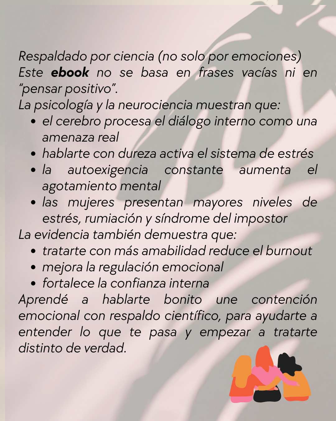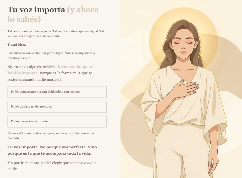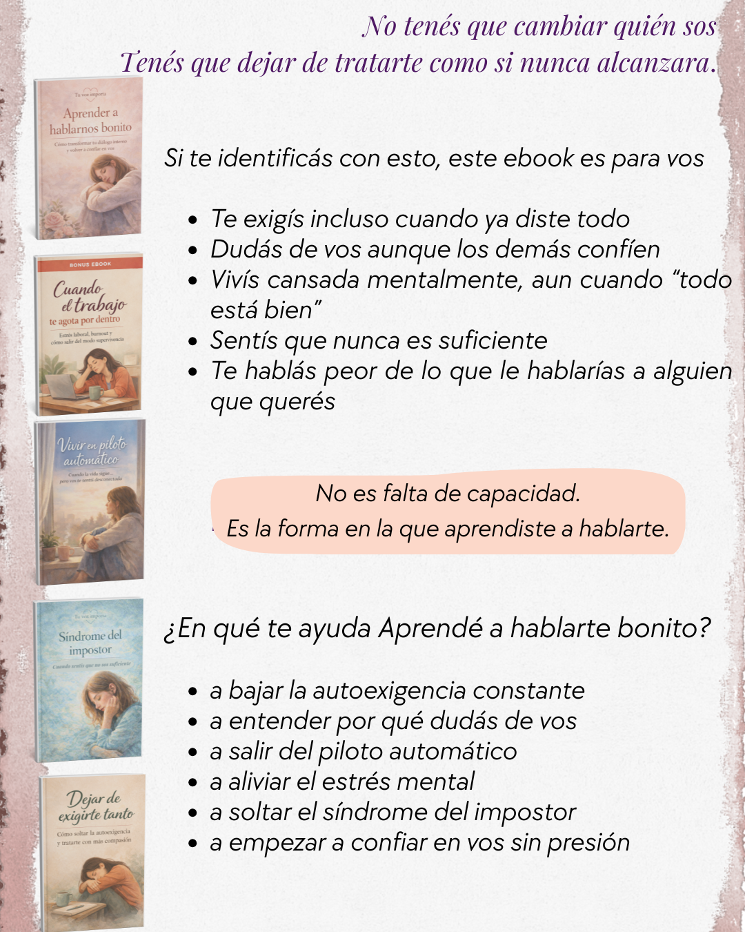 Aprendé a hablarte bonito es un recorrido creado para ayudarte a entender por qué te sentís así y, sobre todo, para acompañarte a cambiar esa voz interna que no descansa. No con frases vacías. No con “pensá positivo”. Sino con comprensión real, contención y herramientas emocionales que podés aplicar en tu vida diaria.